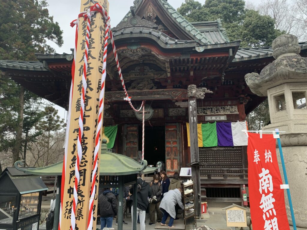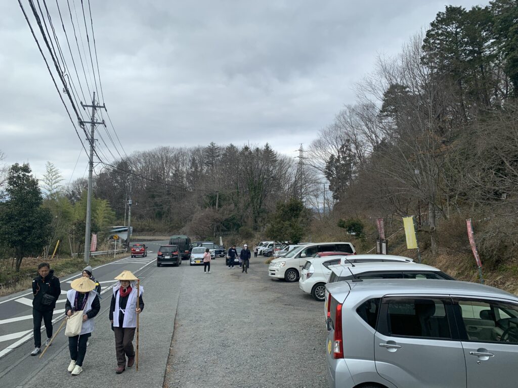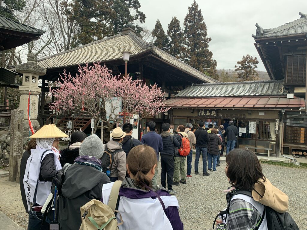 最寄りの栃谷バス停で下車し、全員で札所一番の四萬部寺まで歩くと駐車場は今まで見たことがないくらいの台数の車がとまっており、境内にはいると御朱印を求める長蛇の列がありました。お参りを済ませて参加者のみなさんに並んでいただきましたが、当初20分程度の滞在を予定していましたが50分ほどの滞在になり、しょっぱなから30分遅れでスタートしました。